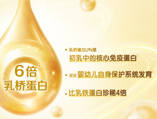 其中,乳桥蛋白LPN是牛初乳中的关键活性成分,在中国妈妈的初乳中含量尤为丰富,被誉为“初乳黄金”。科学研究表明,新生儿免疫细胞数量少、活性低,而乳桥蛋白LPN能够有效激活免疫细胞,促进其数量增长。合生元派星奶粉含有6倍乳桥蛋白LPN,有助于从源头激活宝宝的原生保护力,迅速增加保护细胞的数量,强化自身防御系统,从而提升体质,让纯奶粉喂养的宝宝也能拥有强韧体魄。