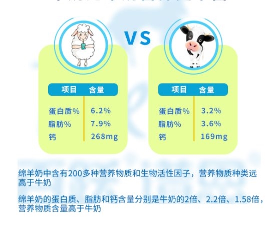 (1)天然乳钙: 绵羊奶的天然钙含量比牛奶高出约30%,吸收率也更高。