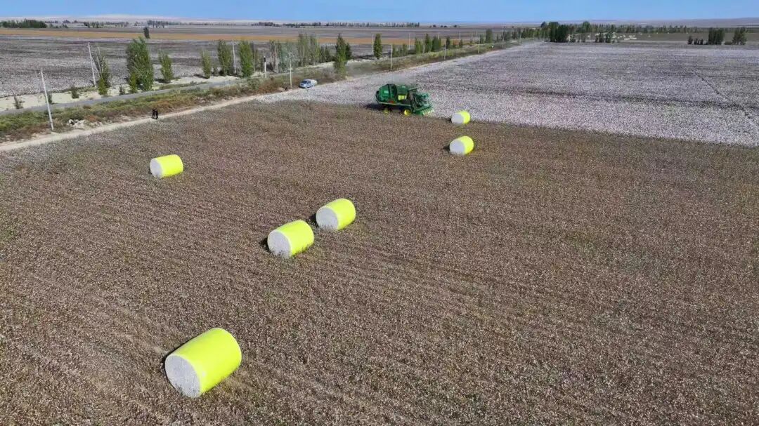 10月11日,和布克赛尔县14.94万亩棉花迎来采收季,其中4万亩为有机棉。田间地头,采棉机轰鸣作业,快速完成采收、打包等工序,整齐的棉包码放地头,呈现出一派丰收景象。和布克赛尔县华丰有限责任公司有机棉基地于2006年通过了中国、欧盟、美国有机认证,取得有机棉资质,2021年其生产的有机棉被列入全国名特优新农产品。近年来,该县大力推广全程机械化采收,从脱叶、采收至储存严把质量关,实现节本增效,助力棉农增收,为乡村振兴注入新动力。