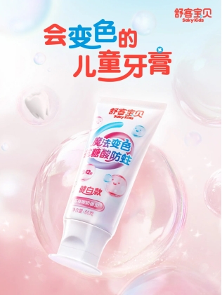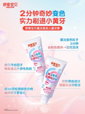 针对儿童护齿的普遍痛点,舒客宝贝精准发力,推出魔法变色儿童牙膏,以趣味设计打破传统刷牙的枯燥感,搭配科学防蛀配方,为孩子口腔健康筑起全方位防护屏障,帮助孩子在趣味中养成良好刷牙习惯。