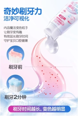 作为产品核心亮点,魔法变色设计精准贴合儿童喜好,解决孩子刷牙敷衍的难题。这款牙膏采用莓莓酸奶香型,粉色膏体中添加安全魔法变色粒子,刷牙过程中,粉色膏体逐渐变成浅蓝色泡泡,将枯燥的刷牙过程转化为趣味游戏,有效延长孩子刷牙时间,确保清洁更彻底,减少蛀牙风险,让每一次刷牙都成为孩子期待的小事。